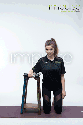 Die Schulterblätter bleiben die gesamte Übung lang hinten (Vorstellung: Stift zwischen Schulterblättern mit Muskelkraft festhalten).
