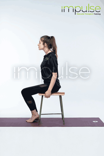 Der Oberkörper bleibt aufgerichtet und stabil, den Kopf nun nach vorne schieben (Schildkröte) und maximal zurückziehen ins Doppelkinn.