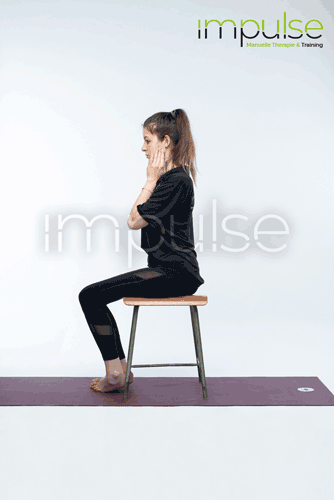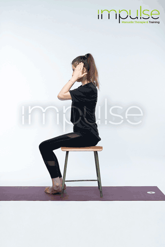 Zur Verstärkung der Übung kann der so eingestellte Nacken zusätzlich auf die Brust gehoben werden, wobei das Kinn immer eingezogen bleibt.