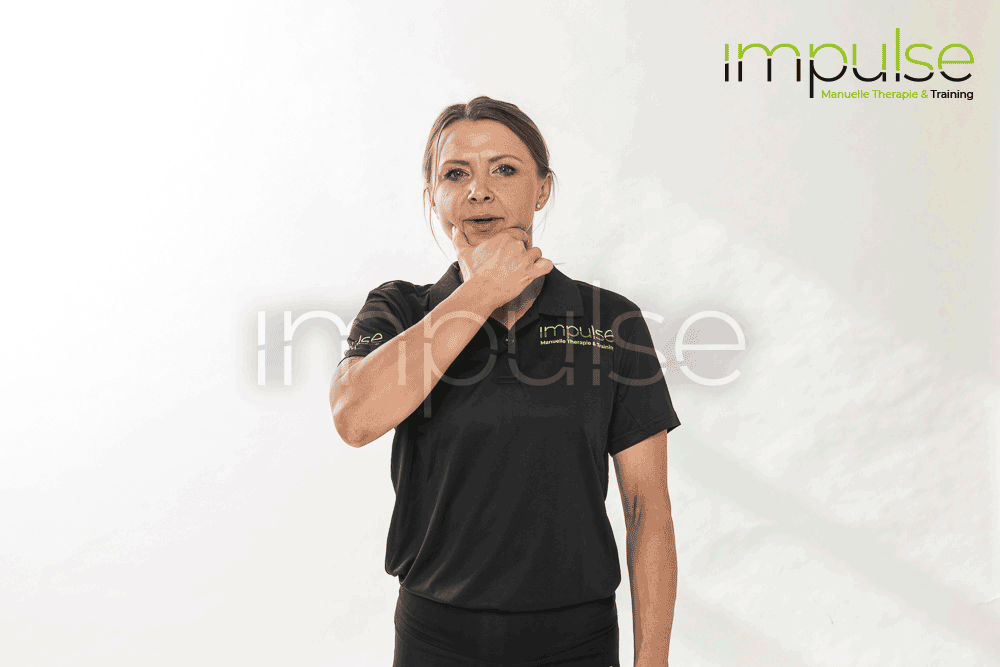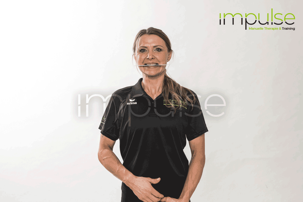 Den Unterkiefer dann maximal zu einer Seite schieben und langsam wieder zur Mitte zurück. Dabei darauf achten, dass der Unterkiefer möglichst nicht zu weit nach hinten geschoben wird.