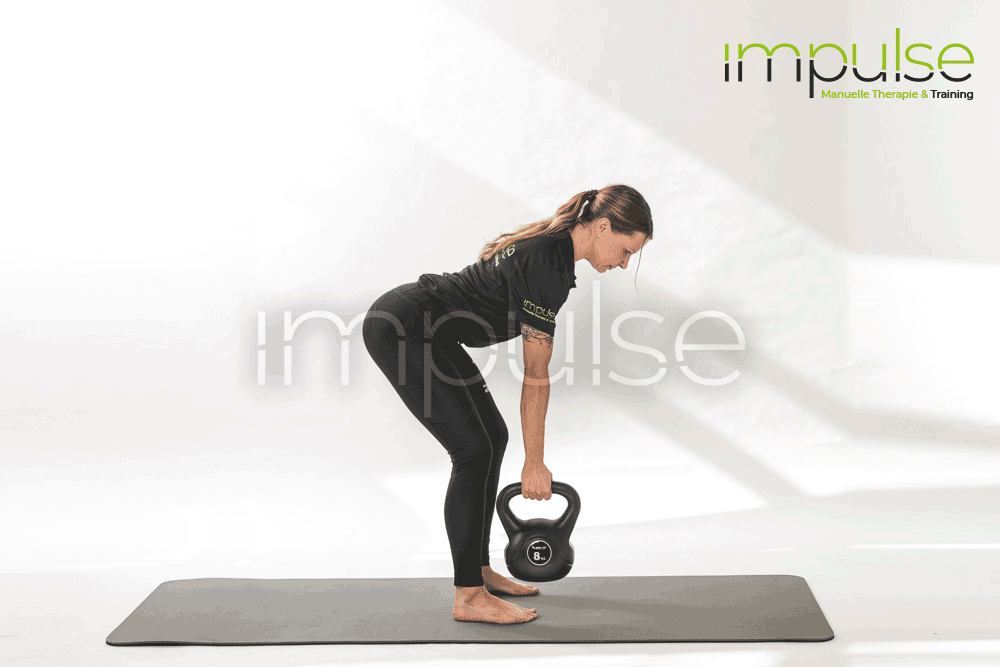 Fester Stand in den Knien, der Rumpf ist stabil, das Kinn leicht eingezogen, der Oberkörper nach vorne geneigt, die Lendenwirbelsäule bleibt gestreckt.
