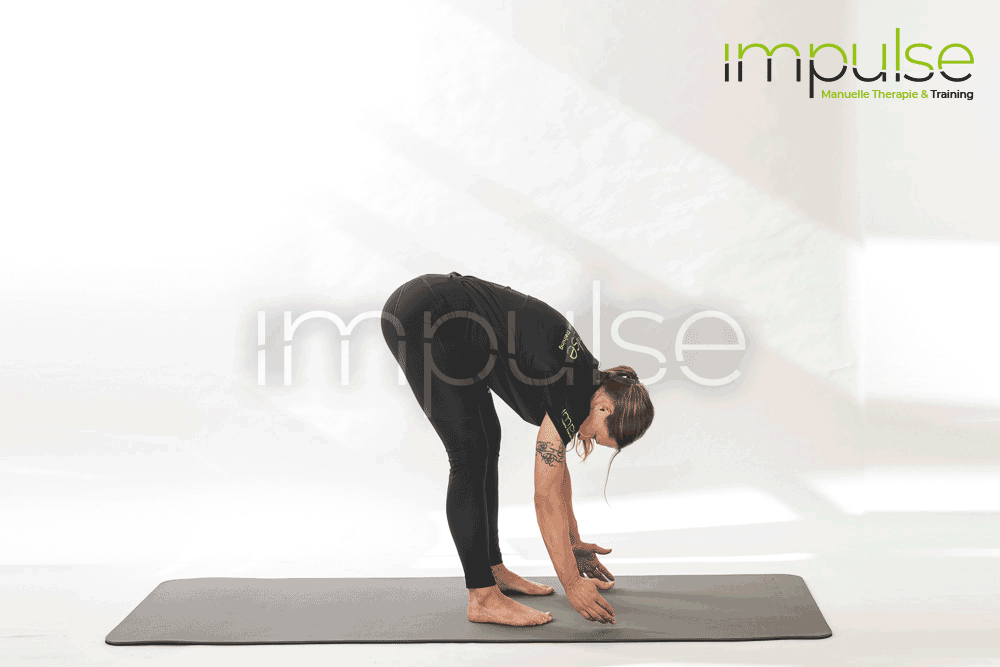Im Stand den Oberkörper mit ausgestreckten Armen nach vorne beugen, bis Sie Bodenkontakt haben.