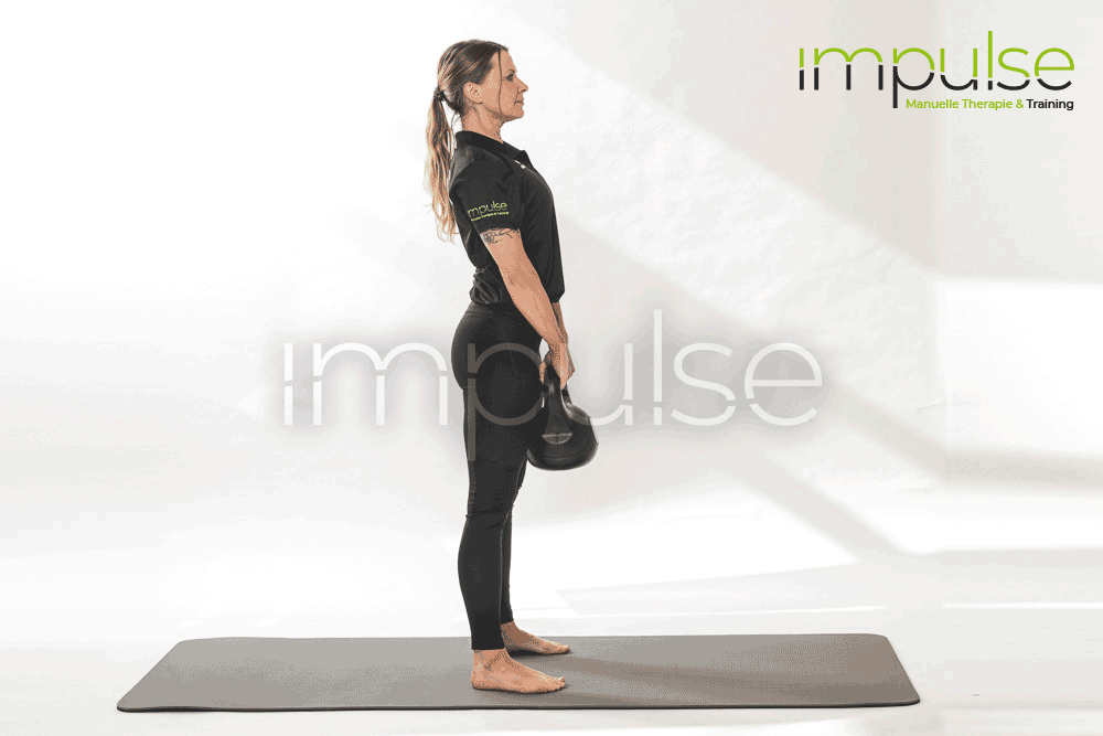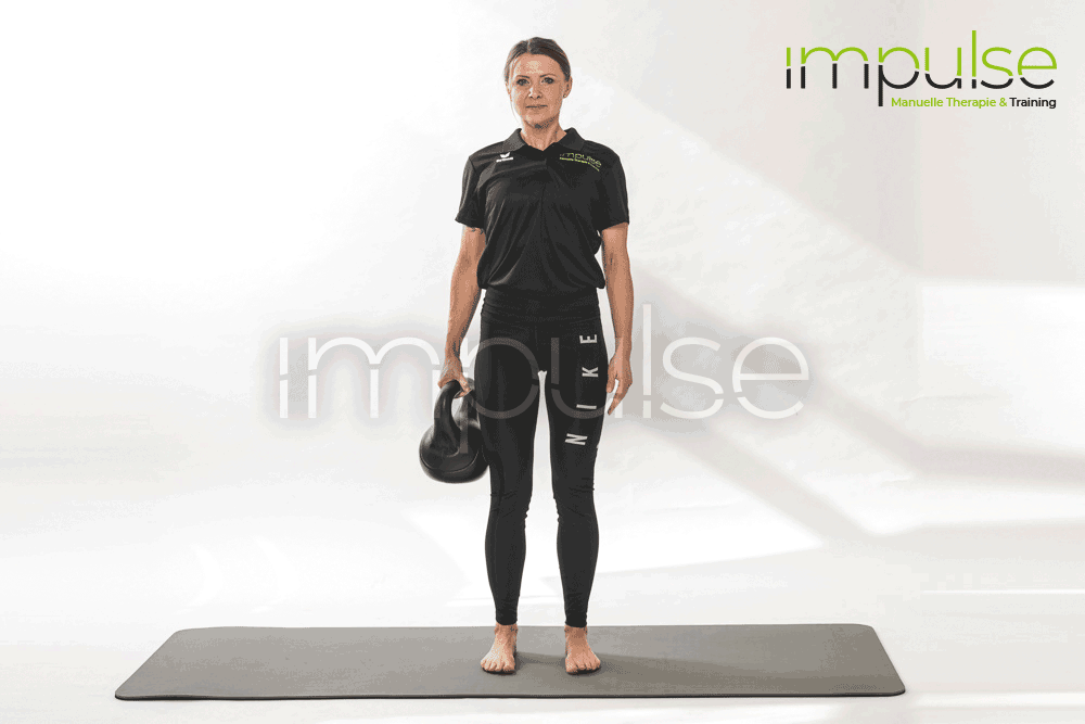 Im Stand eine Hantel oder ein Gewicht in der Hand neben dem Körper halten.